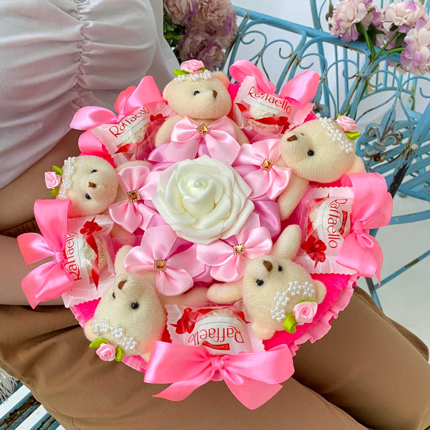 Подарите своим близким кусочек розового неба с этим очаровательным букетом из 5 плюшевых мишек нежного розового цвета и 5 вкуснейших конфет Raffaello.