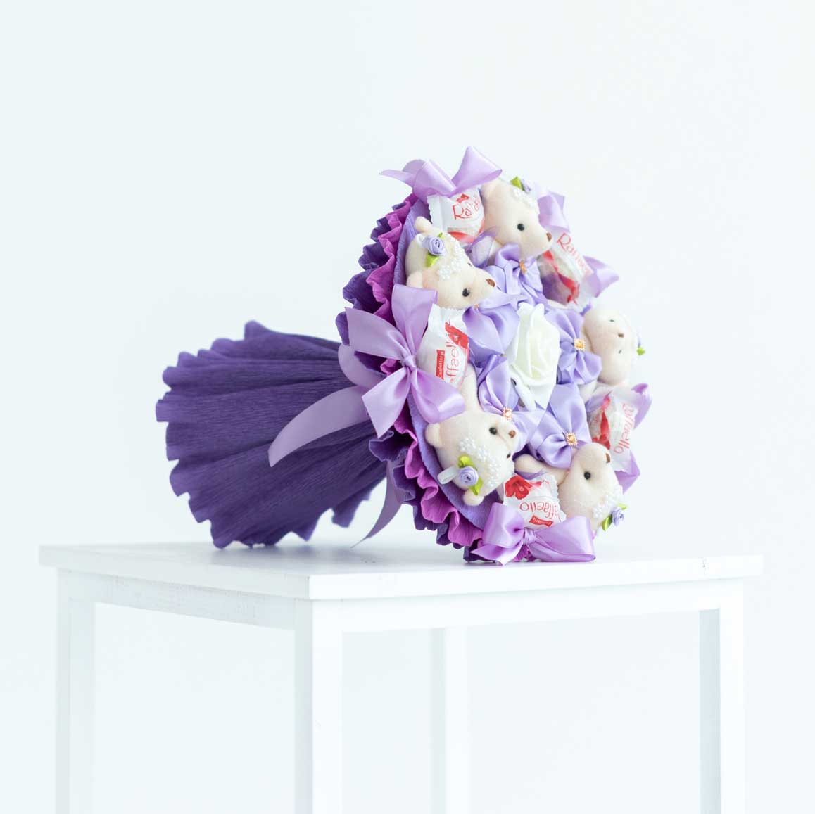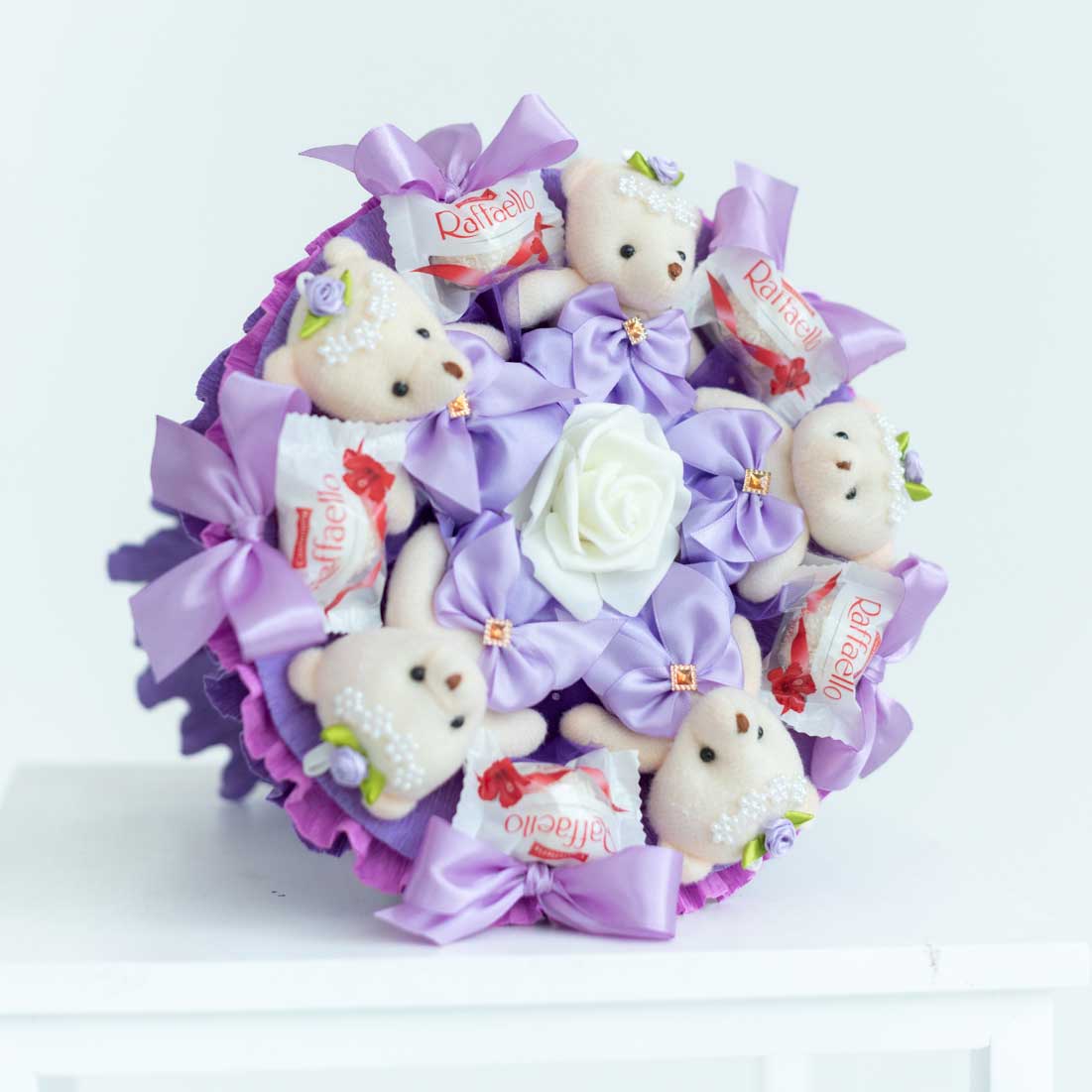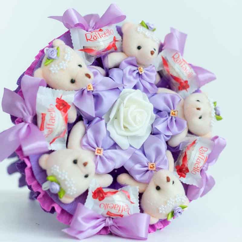 Подарите своим близким кусочек фиолетового неба с этим очаровательным букетом из 5 плюшевых мишек нежного фиолетового цвета и 5 вкуснейших конфет Raffaello.