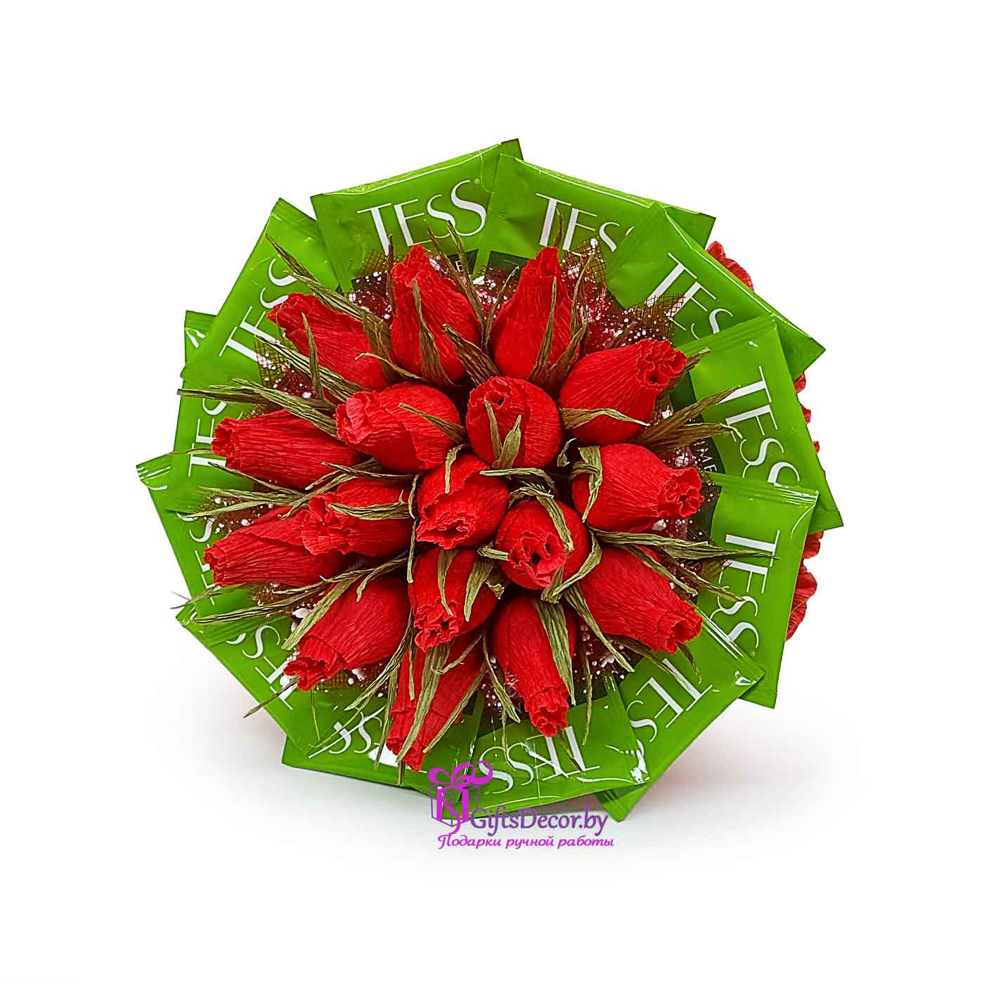 Букет с чаем и конфетами станет идеальным вариантом при выборе недорогого, но достойного и стильного подарка. Такой букет можно преподнести учителю, подруге, маме , коллеге по работе. Букет можно выполнить в любой цветовой гамме.