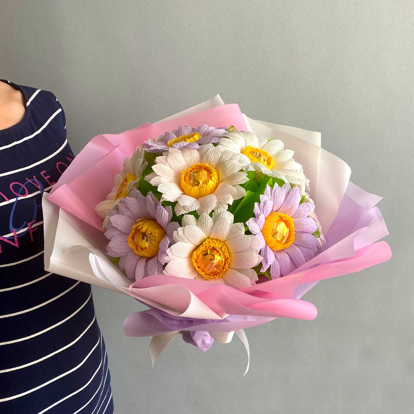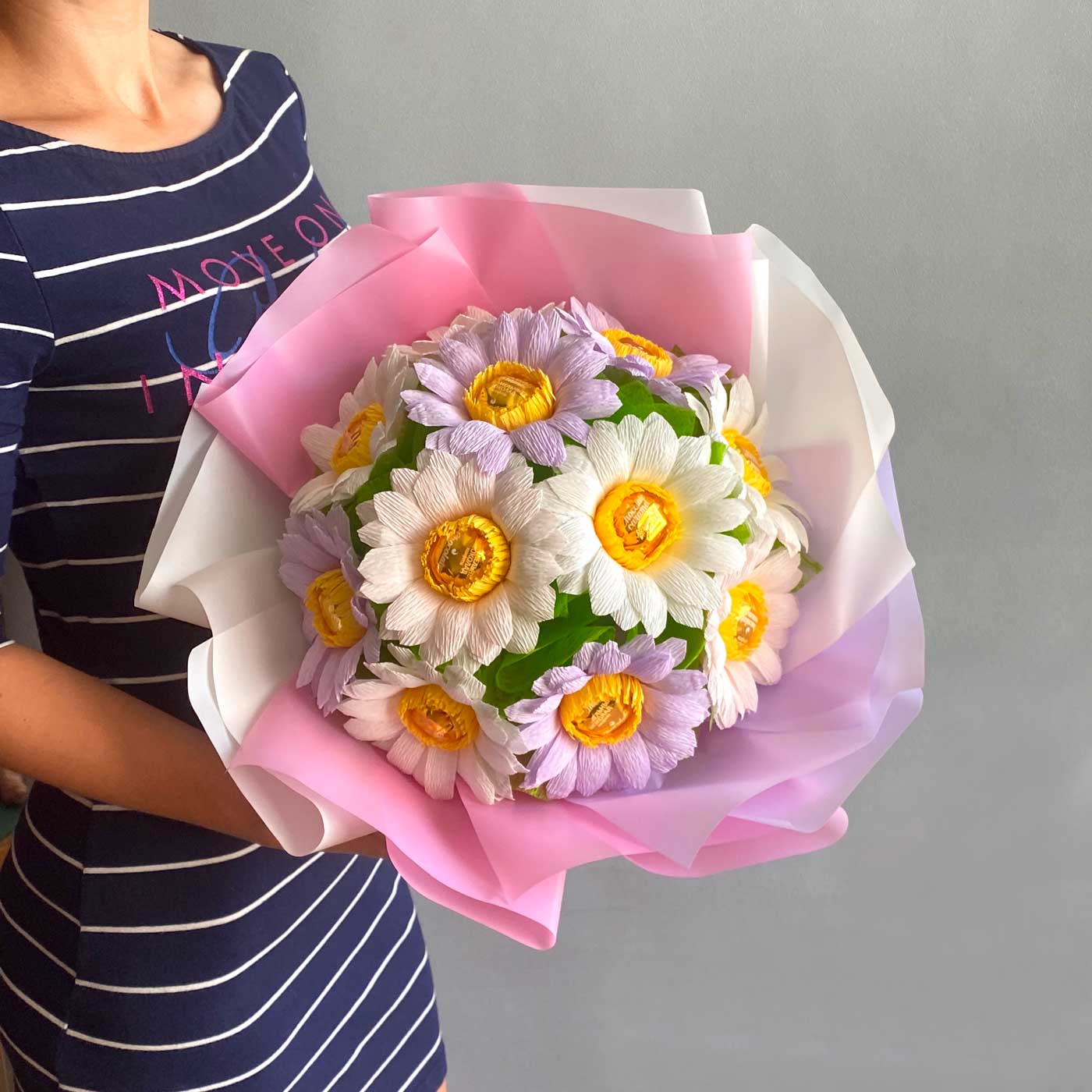 Букет из конфет «Ромашки» воплощает весеннюю лёгкость и радость в сладком формате. Конфеты оформлены так, что напоминают нежные цветы ромашек. Это идеальный подарок, чтобы порадовать близкого человека без повода.