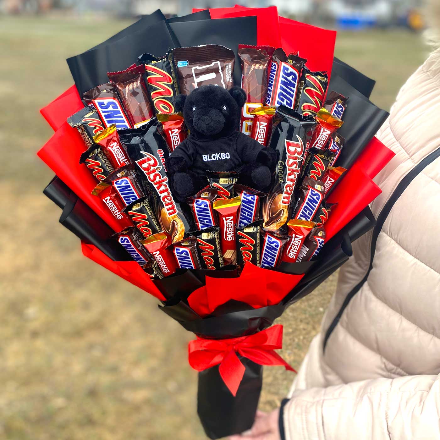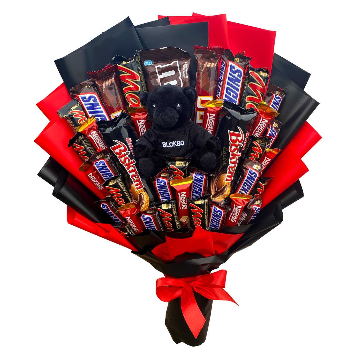 Букет «Блэкбо» объединяет мягкую игрушку и любимые сладости в красивой и яркой композиции. Это идеальный сюрприз на день рождения, праздник или просто так.